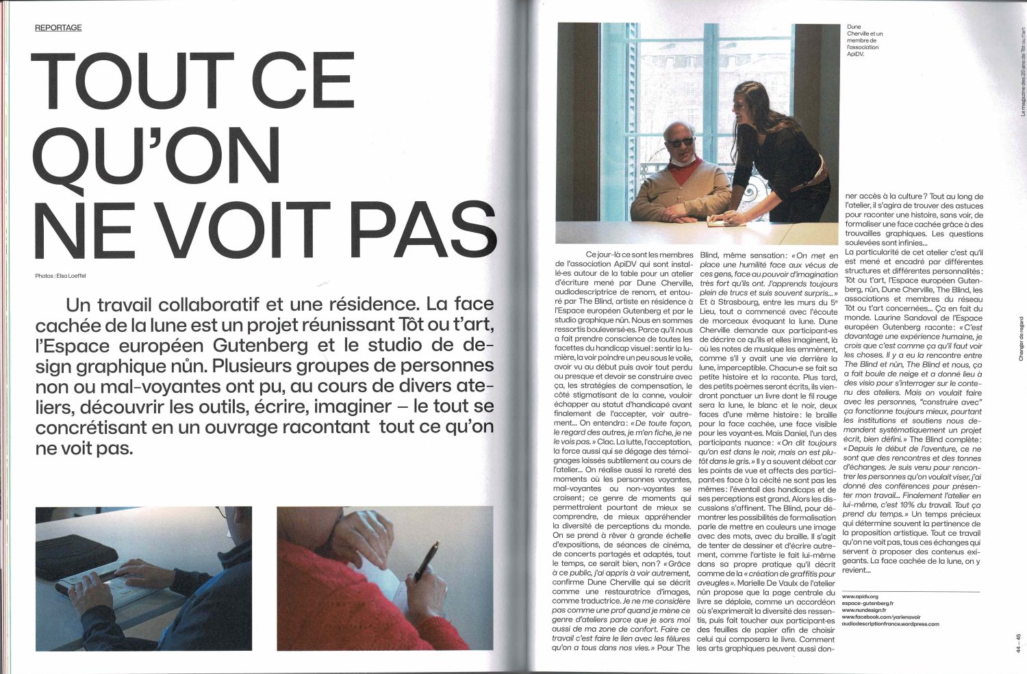 Tout ce qu’on ne voit pas Un magazine a été édité à l'occasion des 20 ans de l'association Tôt ou T'art, dans ce cadre découvrez le reportage consacré au projet La face cachée de la lune.